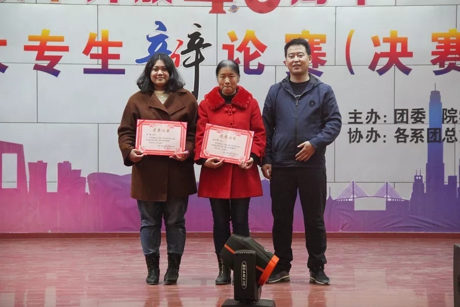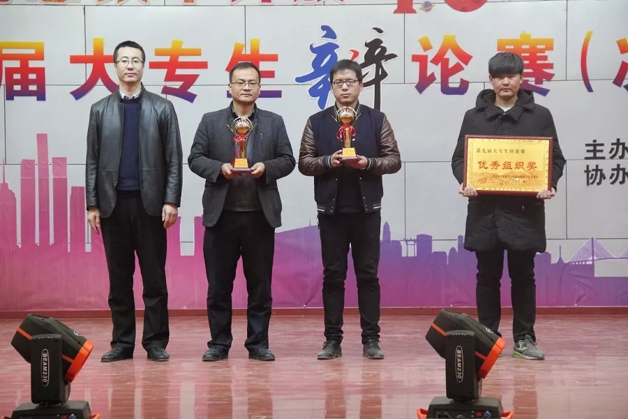 决赛现场,周凤雄老师代表评判团对本场辩论赛进行了精彩点评,并对辩手提出了指导性意见。学生工作处副处长白仕珑为获奖个人颁发了荣誉证书,团委副书记贾德旺为各获奖团体颁发了奖杯和奖牌。