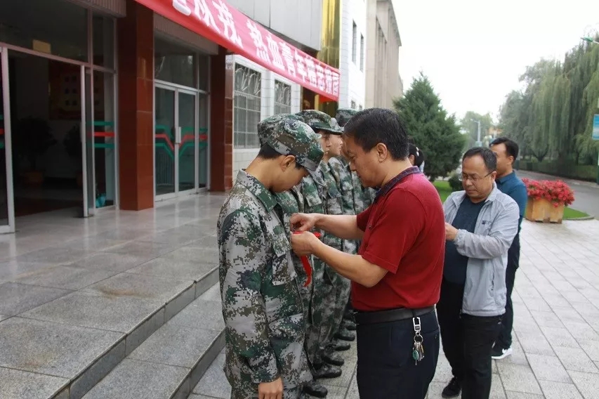 9月8日下午四点,在学院办公楼前,副院长王祎才带领各系党总支书记为我院身着迷彩服的17名学子佩戴红花,并和新兵家长及辅导员们一同合影留念。