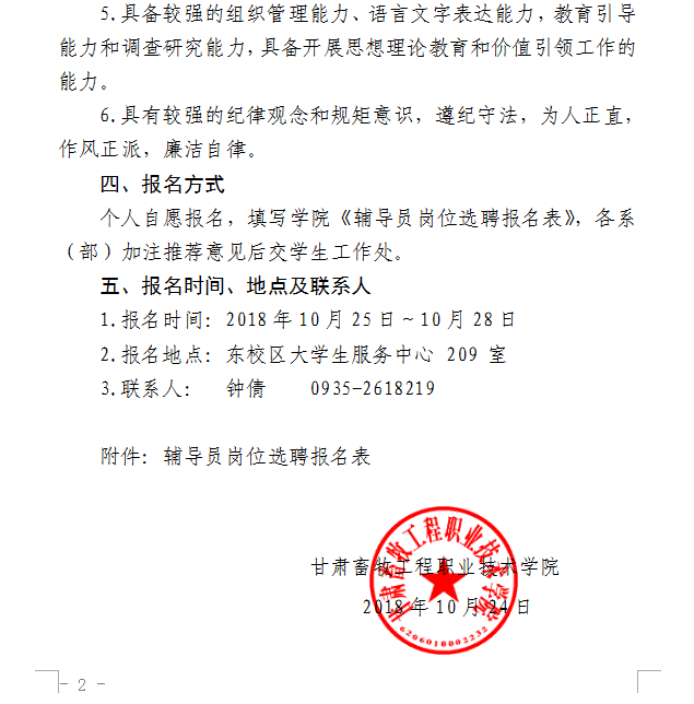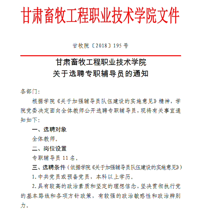 甘肃畜牧工程职业技术学院关于选聘专职辅导员的通知